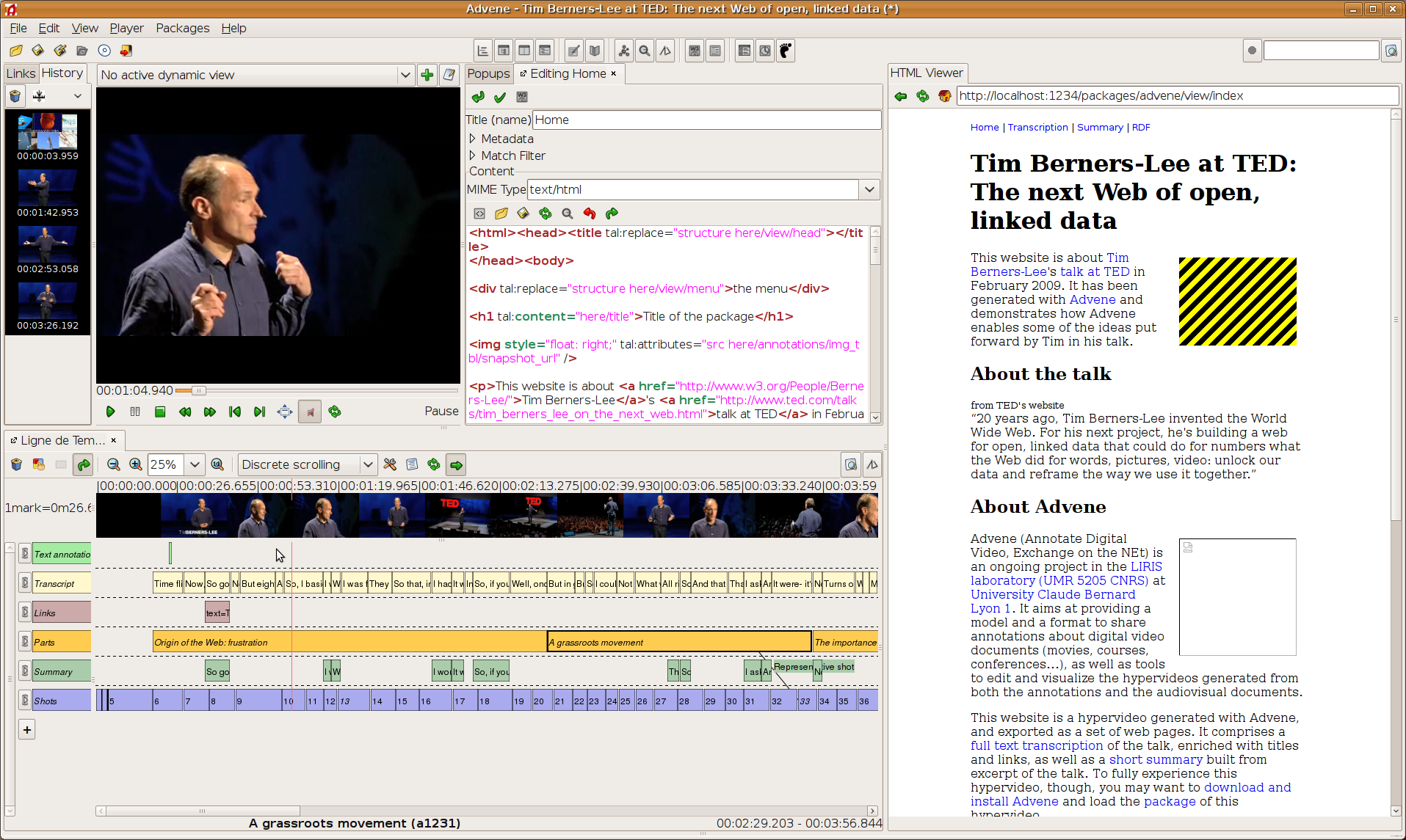 This website is about Tim Berners-Lee's talk at TED in February 2009. It has been generated with Advene and demonstrates how Advene enables some of the ideas put forward by Tim in his talk.